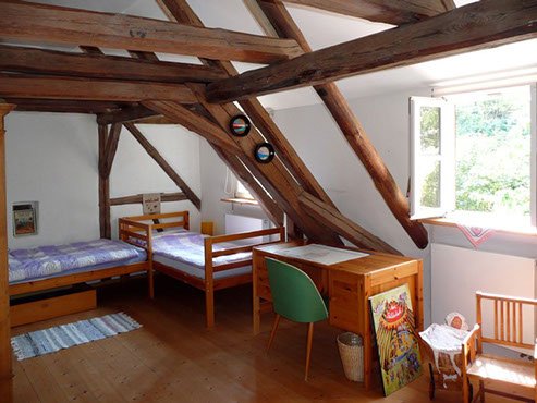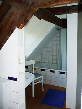 Die 1. Etage (Dachgeschoss) ist in zwei Doppelzimmer und ein Bad (mit Wanne, Waschbecken und WC) unterteilt.