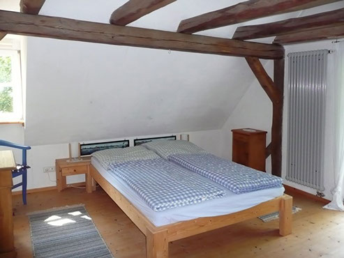 Die 1. Etage (Dachgeschoss) ist in zwei Doppelzimmer und ein Bad (mit Wanne, Waschbecken und WC) unterteilt.
