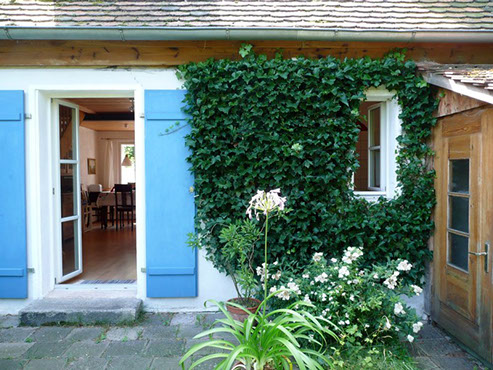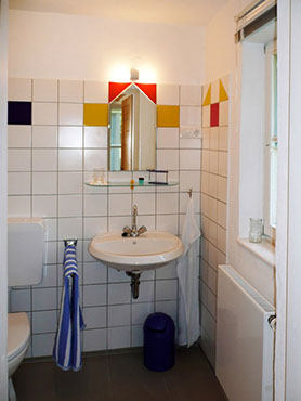 Hier ist auch das das Bad (mit Dusche, Waschbecken, WC).